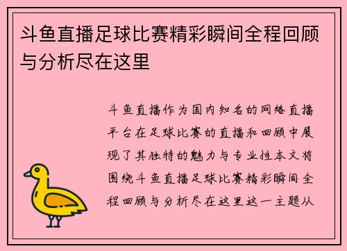 斗鱼直播足球比赛精彩瞬间全程回顾与分析尽在这里